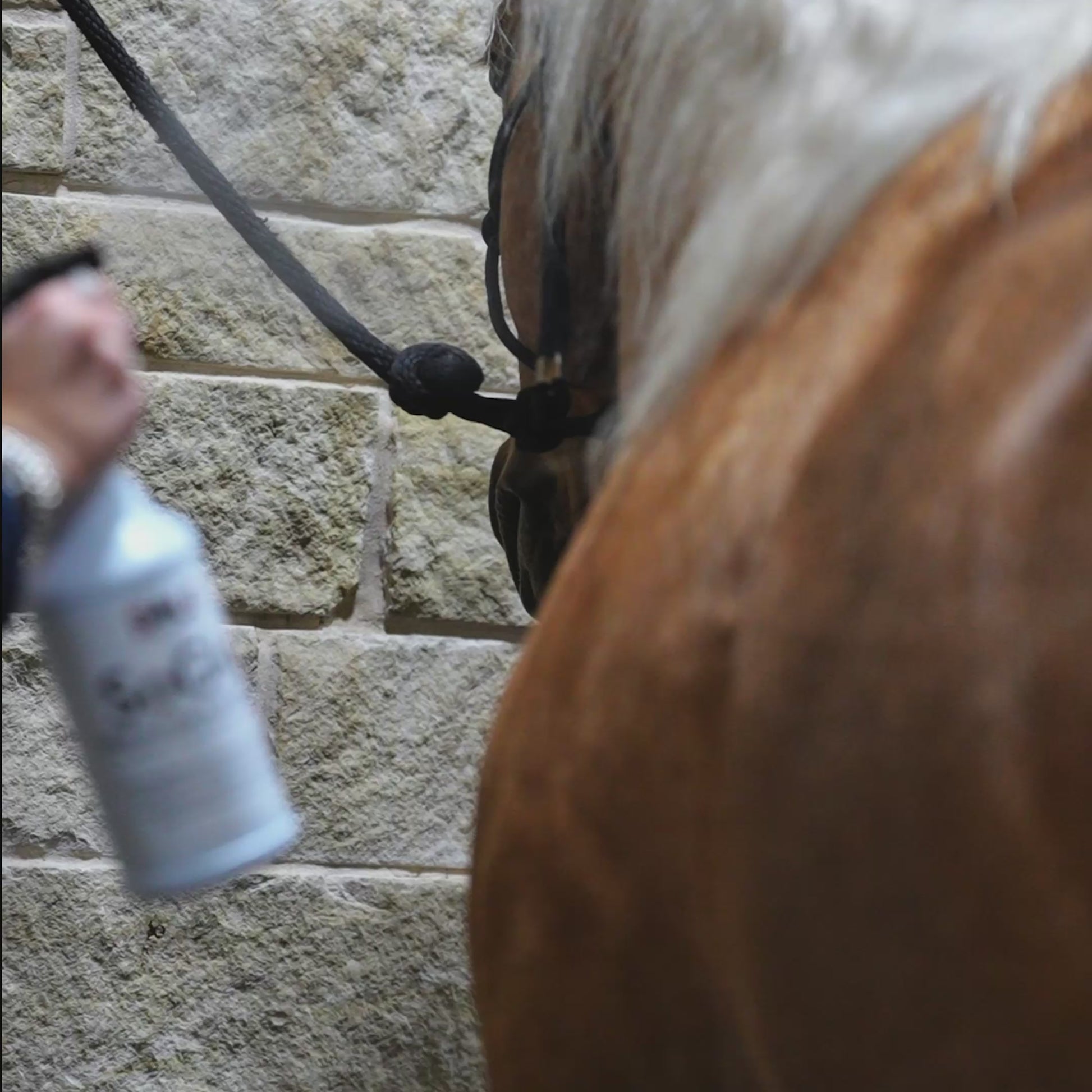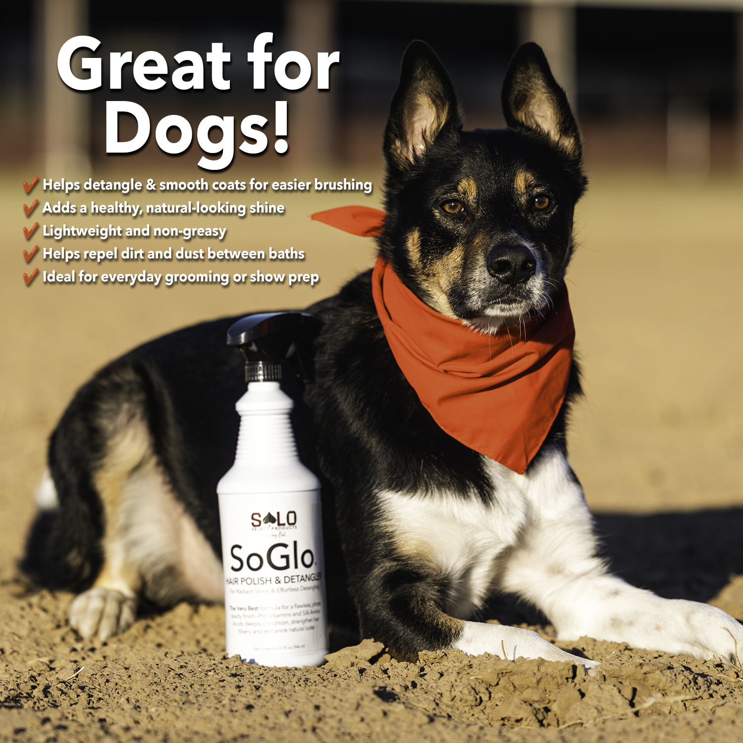 Wash and rinse the animal thoroughly. Remove excess water with a sweat scraper or towel. Spray SoGlo™ evenly onto the coat, then comb or wipe in the direction of hair growth. For detangling, apply directly to the mane or tail, allow to dry, and comb through.